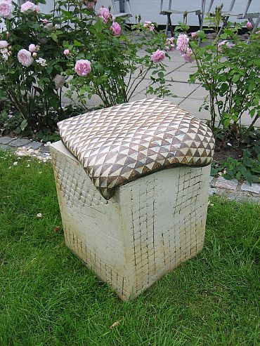 Betty Engholm (1933) er keramiker og billedhugger, og arbejder med keramiske udsmykninger og skulpturer til gårdrum, haver, parker og på offentlige pladser. Som billedhugger er hun fascineret af formen, og som keramiker er det materialets muligheder, der er drivkraften. Hun vil gerne lave ting, der kan anvendes. Det var sådan hun fandt frem til siddeskulpturen, hvis store stentøjsarbejder er både vejrbestandige og frostsikre, da de brændes ved meget høj temperatur.