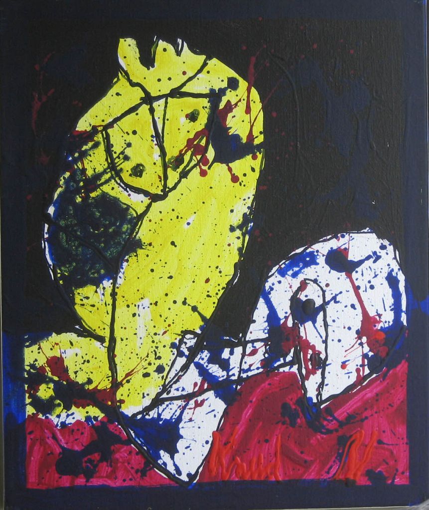 Skønt Knud Nielsen på mange måder var forbundet med Cobra-folkene, og udstillede med dem ved flere lejligheder, bl.a. på de berømte Høstudstillinger fra 1947-49, var han på det tidspunkt mere optaget af det konkrete maleri. Vi skal frem til begyndelsen af 60’erne, før han fandt det sprog, som han i dag identificeres med. Et sprog som ville have gjort ham til et selvskrevet medlem af Cobra.