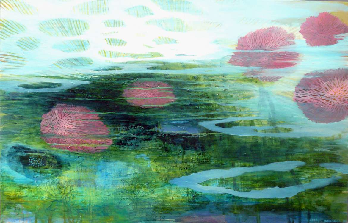 Inka er inspireret af vand på alle mulige måder; livet under vand, vandets bevægelser og struktur, og skoven, som omgiver hendes hjem. Hun skaber en verden, hvor elementerne synes at svæve eller flyde upåvirket af tyngdekraften. Der er lys gennem transparente lag, sammensat med kraftfuld mørke i pastose strøg. Virkeligheden er fraværende og dog insisterende nærværende.