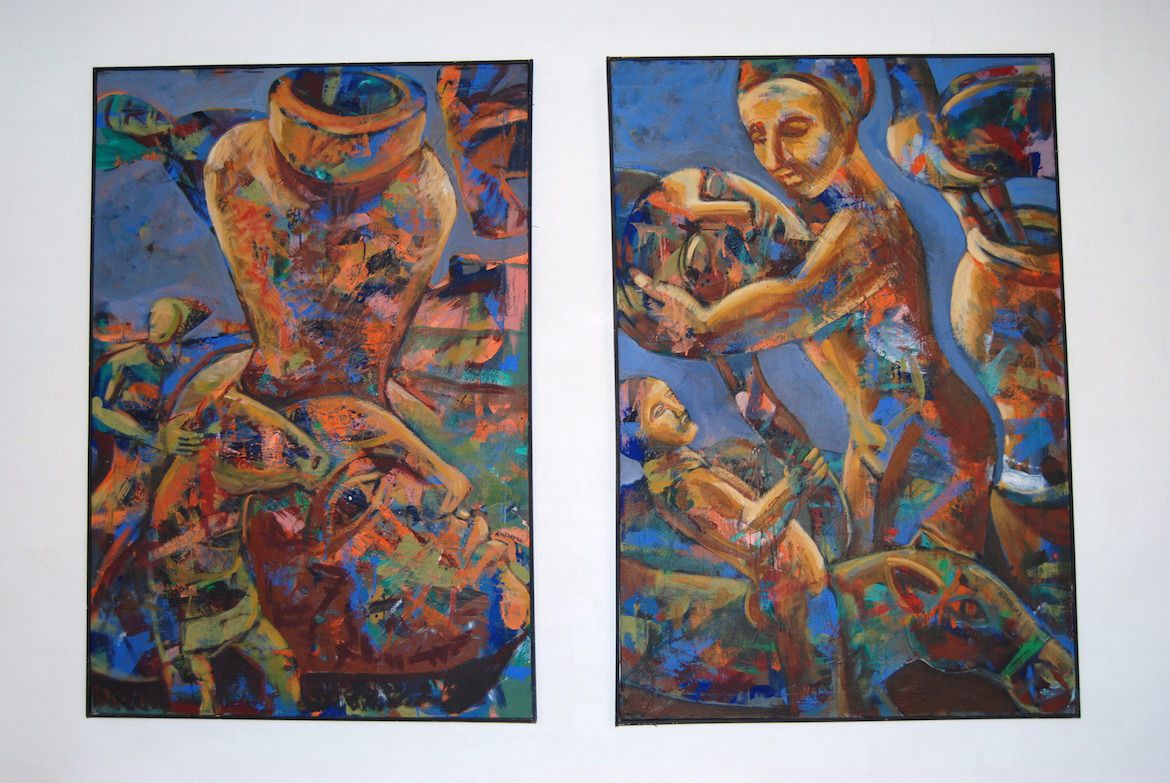 Der vises både malerier, tegninger og skulpturer – og ved at kigge godt på udstillingens logo, er det muligt at genkende nogle af kunstnernes værker.